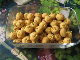 شيريني هاي آماده را با فاصله روي سيني فري که کف آن کاغذ روغني انداخته ايد، بچينيد و روي هر کدام يک خلال پسته بگذاريد.